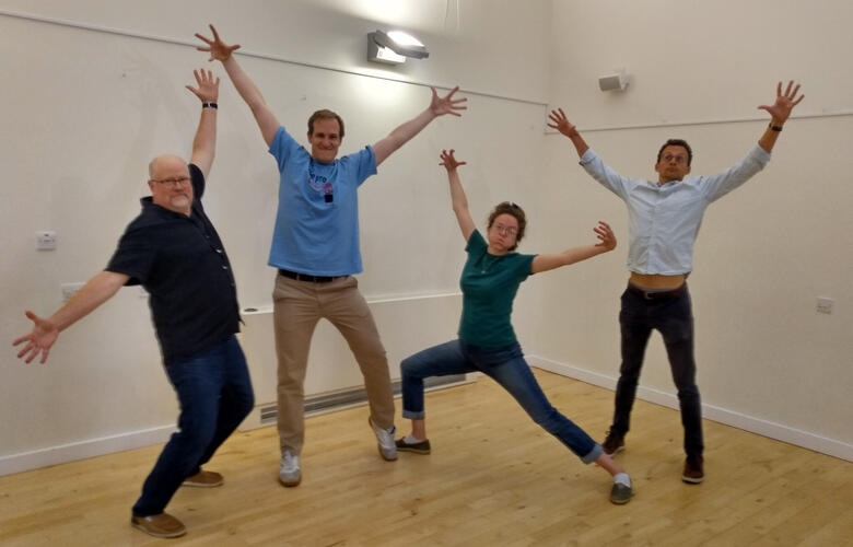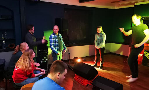The session is led by Ed Smith, performer in the Awkward Actors Improv Comedy group and faculty tutor for the Improv in 6 Acts course, assisted by other members of the Awkward Actors.